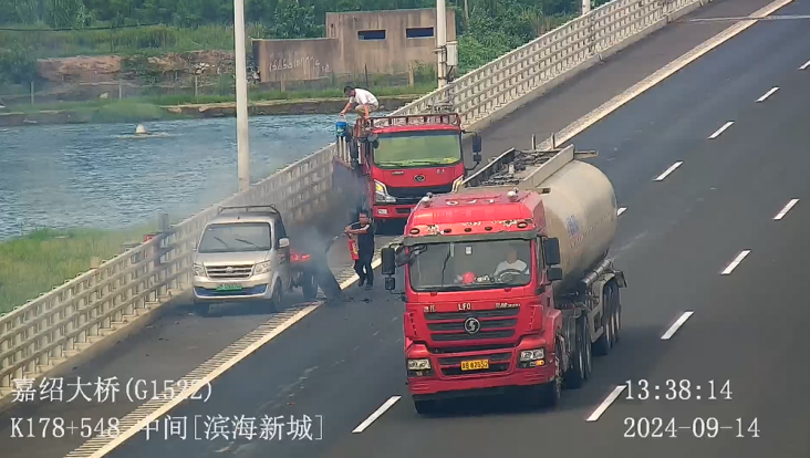 9月14日下午13时26分,嘉绍大桥监控指挥中心视频巡查发现,台州方向K178+400处一小货车停靠应急车道,车厢后方有明显火焰,烟雾滚滚,车上人员已下车并用衣物拍打试图灭火。针对险情,指挥中心迅速行动,第一时间指派道路应急救援力量与大桥消防队赶往现场,并通过广播提醒可用应急车道边护栏配备的灭火器灭火。