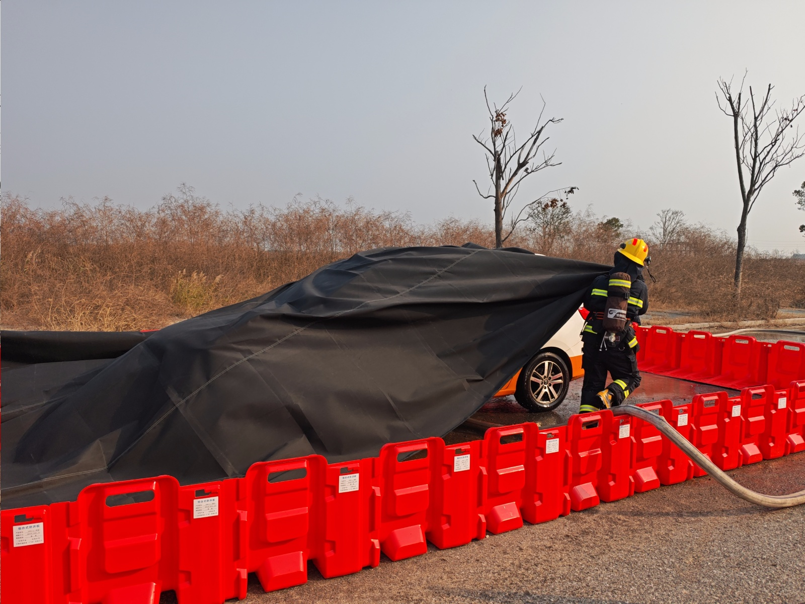 此次新增的装备针对性极强:耐高温专用灭火毯可快速覆盖车身,隔绝空气抑制明火蔓延;电动剪扩器能高效破拆车辆结构,为救援开辟通道;车底喷水装置采用模块化设计,组装快速简便,连接消防水带后可精准对车辆底盘电池组持续喷淋降温,适配多车型需求;挡水围堰则通过快速围合形成封闭区域,配合注水实现电池“全淹没”冷却,从根源遏制热失控与复燃风险 。这些装备的投入使用,有效弥补了传统灭火器材在新能源汽车火灾处置中的短板,为救援工作提供了充分的硬件支撑。