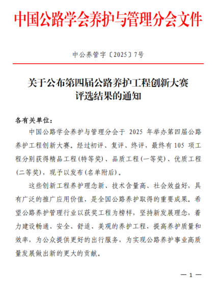 近日,中国公路学会养护与管理分会第四届公路养护工程创新大赛获奖名单揭晓,嘉绍大桥榜上有名。经过层层选拔与专家评审,全国共105项工程脱颖而出。其中,嘉绍大桥钢桥面ERS铺装温度监测与洒水降温养护工程凭借前瞻性的养护理念、先进的技术应用与显著的社会经济效益,荣获大赛一等奖(品质工程)!