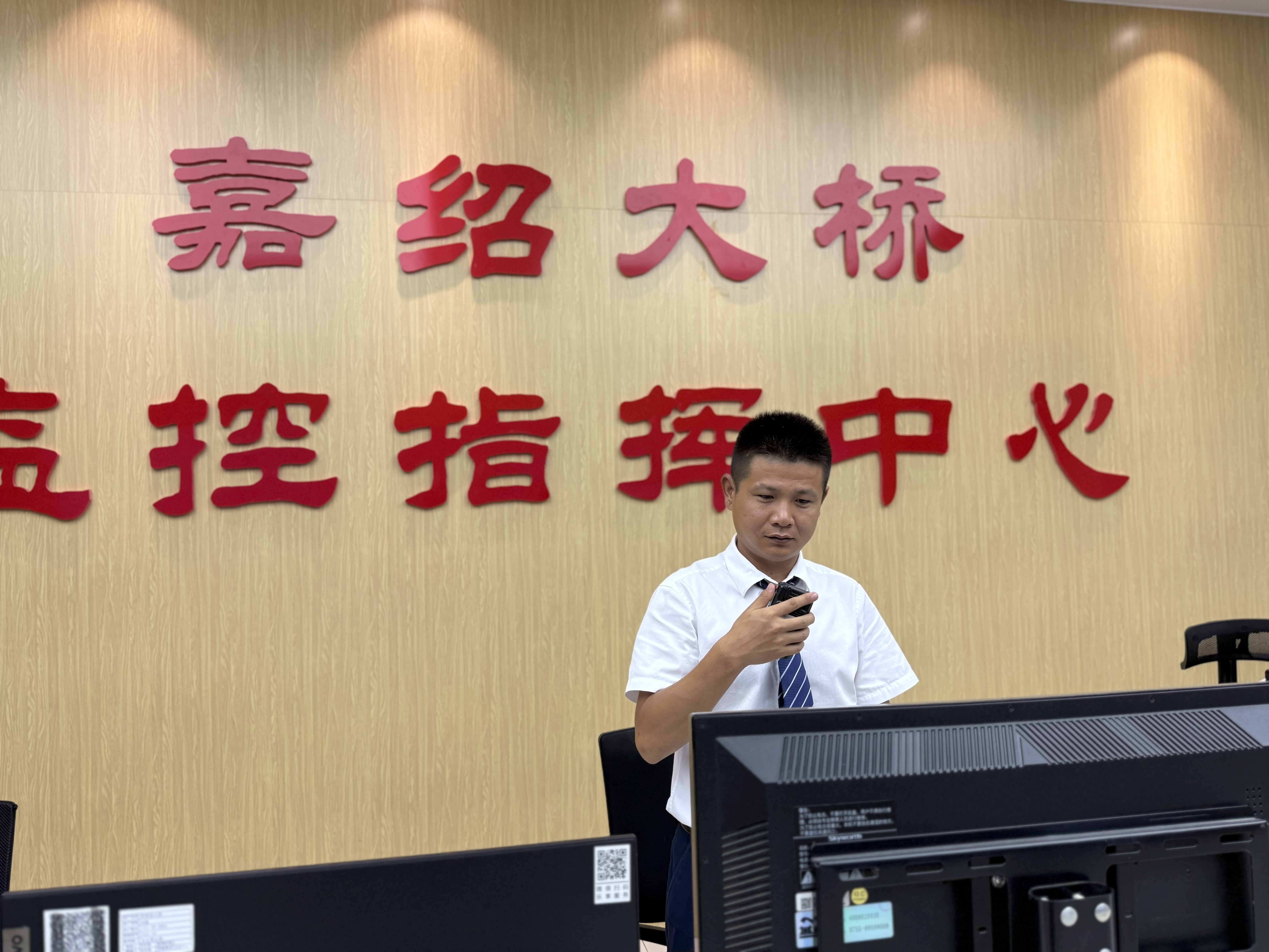 “镜头拉近,看一下南引桥路段车流情况。”“绍向K177处有车辆缓行,请巡逻车前往查看。”监控员史伟手持对讲机用响亮坚定的声音一边对施救单位下达着指令,一边提醒班组成员调看摄像机。而走进嘉绍大桥监控指挥中心,巨大的电子屏幕上实时切换着大桥各关键点位的画面,电话铃声、对讲机指令声、键盘敲击声此起彼伏,气氛紧张而有序,这里就是大桥安全畅通运行的“中枢神经”。监控员们目光如炬,紧盯着屏幕上不断跳动的数据流和实时影像,不放过任何一丝异常。他们通过数百个高清摄像头,如同为大桥装上了“智慧眼”,全天候感知桥面路况。应急指挥调度,信息的上传下达、突发事件的初步研判都在这里高效运转。在嘉绍大桥通车以来的无数个假期里,他们都用精准的指令与不间断的守望,扮演着车流中的“隐形指挥官”,确保每一段路程都可监、可控、可溯,为公众出行提供最及时的服务与指引。
