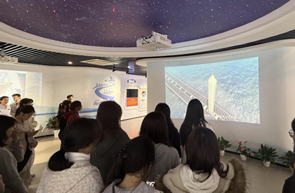 在大桥文化展厅,讲解员借助多媒体为师生们讲解大桥“多塔斜拉”结构创新原理与施工过程。生动的三维演示将大桥建设的关键技术与复杂工序清晰呈现,充分展现出我国桥梁工程领域的科技实力与自主创新能力。讲解中还重点介绍了“护桥尖兵”等党建品牌案例,彰显党建引领在凝聚合力、推动工程建设中的重要作用。