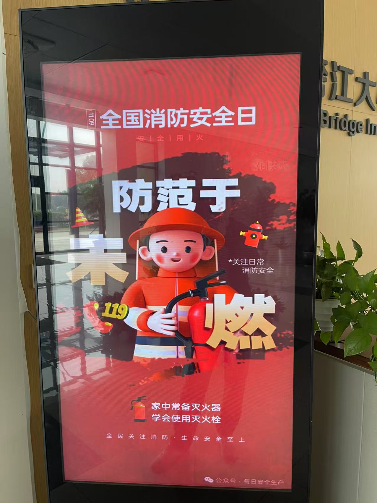 公司充分利用各类宣传阵地,全方位、多角度普及消防安全知识。通过公司官方微信公众号推送专题宣传片,在办公大楼一楼电子显示屏循环播放主题标语,利用大桥情报板等向过路司乘大力宣传消防安全提示。