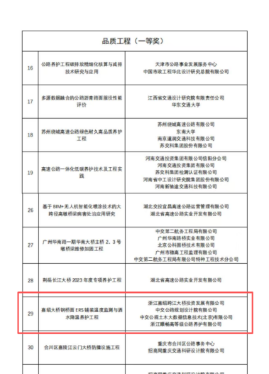 近日,中国公路学会养护与管理分会第四届公路养护工程创新大赛获奖名单揭晓,嘉绍大桥榜上有名。经过层层选拔与专家评审,全国共105项工程脱颖而出。其中,嘉绍大桥钢桥面ERS铺装温度监测与洒水降温养护工程凭借前瞻性的养护理念、先进的技术应用与显著的社会经济效益,荣获大赛一等奖(品质工程)!