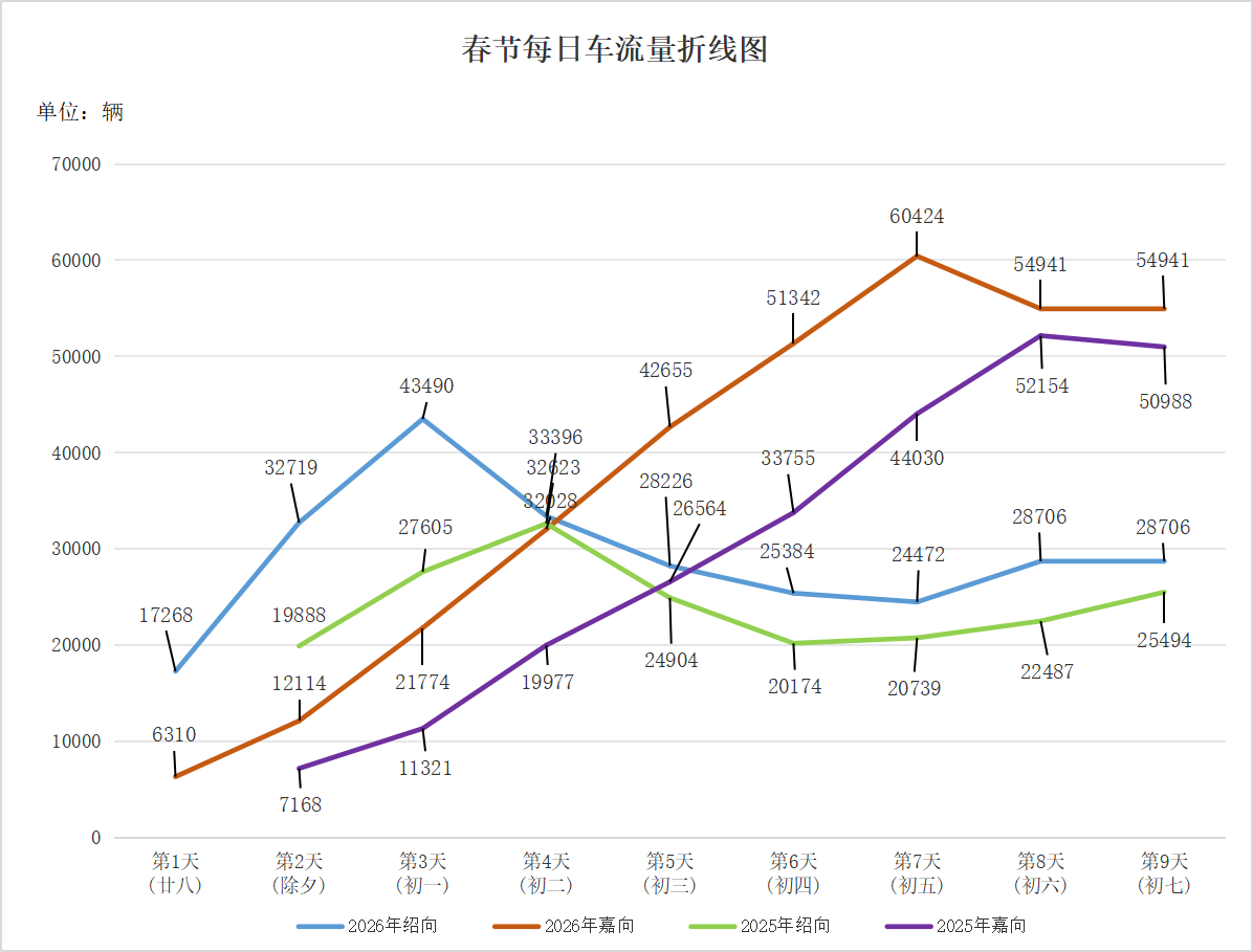 为确保春节期间大桥安全畅通,给广大司乘人员提供优质出行服务,嘉绍大桥公司提前部署、科学研判、狠抓落实,安全保畅工作圆满完成。春节期间,大桥通行流量总计56.05万辆,日均6.2万辆,同比上升13.28%。其中,免费通行54.25万辆次,免收通行费约2100万元,展现了高效的服务能力和坚定的责任担当。