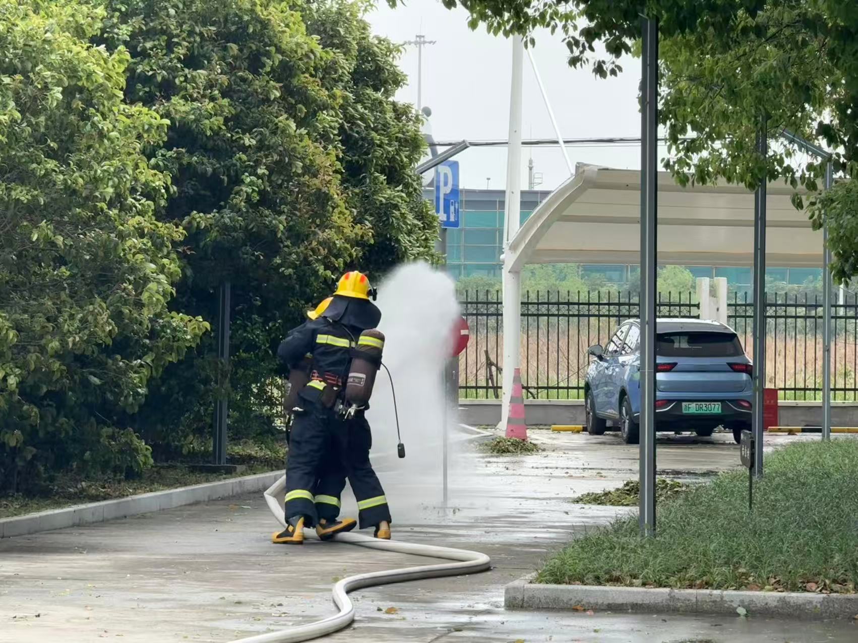 赛场上,随着裁判“开始”口令的下达,选手们迅速进入状态。只见大家原地快速着装,佩戴空气呼吸器、防护服等个人防护装备,动作规范利落;驾驶员迅速登车启动、连接出水口、精准控制供水压力;另外两名队员分工明确、配合默契,先后完成干线水带与支线水带的铺设、连接分水器、架设水枪等一系列操作,快速推进至射水线,稳定出水中靶,整个过程紧张有序、衔接流畅。